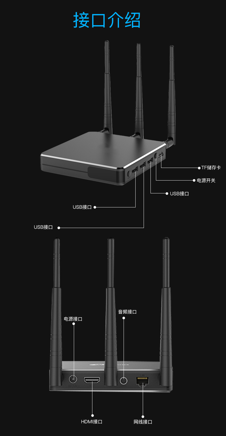 3,接收端內置兩個wifi模塊,一個用于產生熱點用于傳屏,另外一個用于連接辦公室網絡,無需連接網線使得連接熱點正在傳屏的移動終端還能上網,投屏上網兩不誤。
